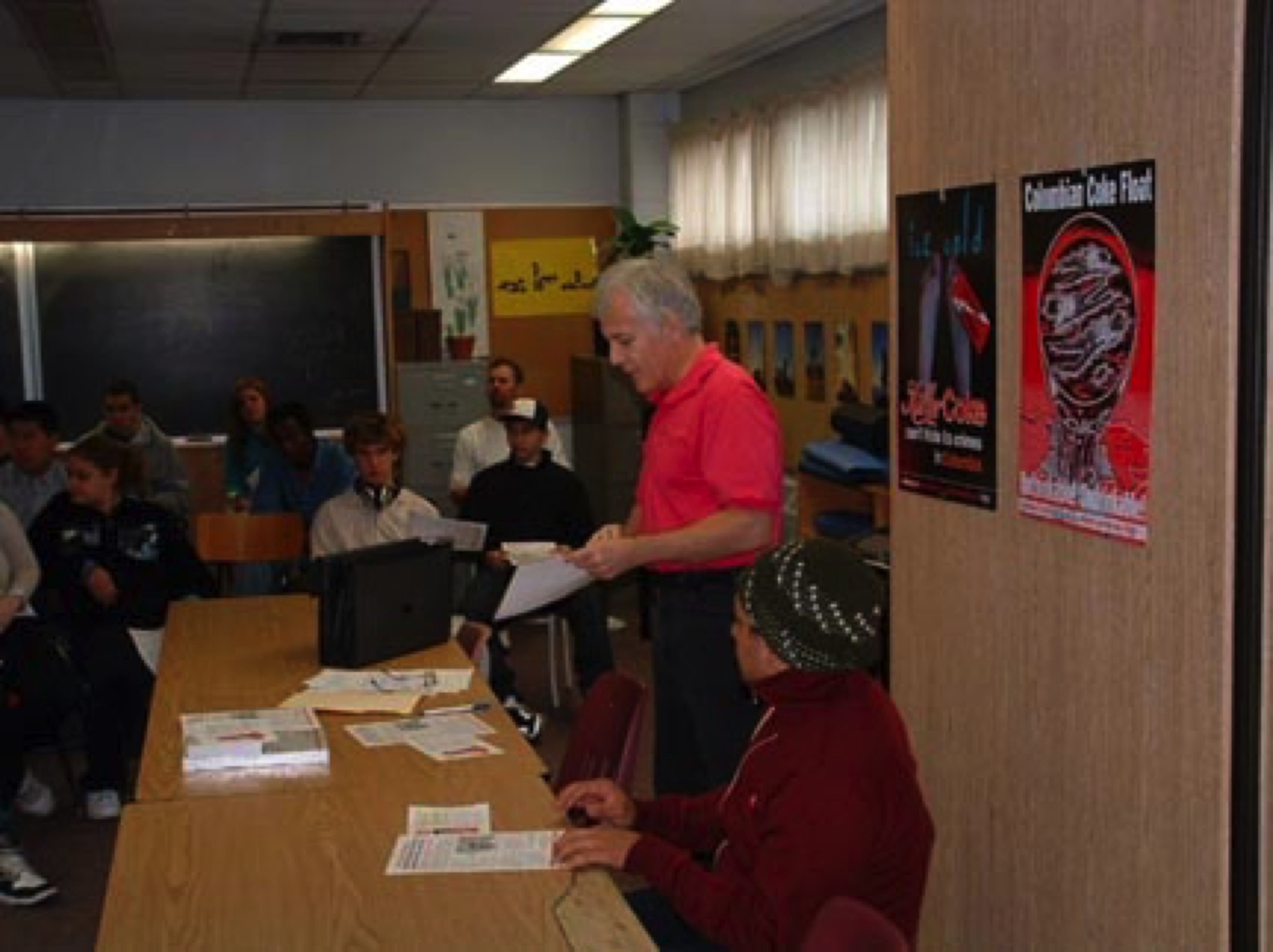 This event was hosted by the Amnesty International Club at Coral Gables High School in Coral Gables, Florida on Feb. 9, 2006. Many booths showed different violations of human rights and Killer Coke had its own both. Five hundred people attended the event and at least 300 people signed a request to end the sale of Coke products in the school.