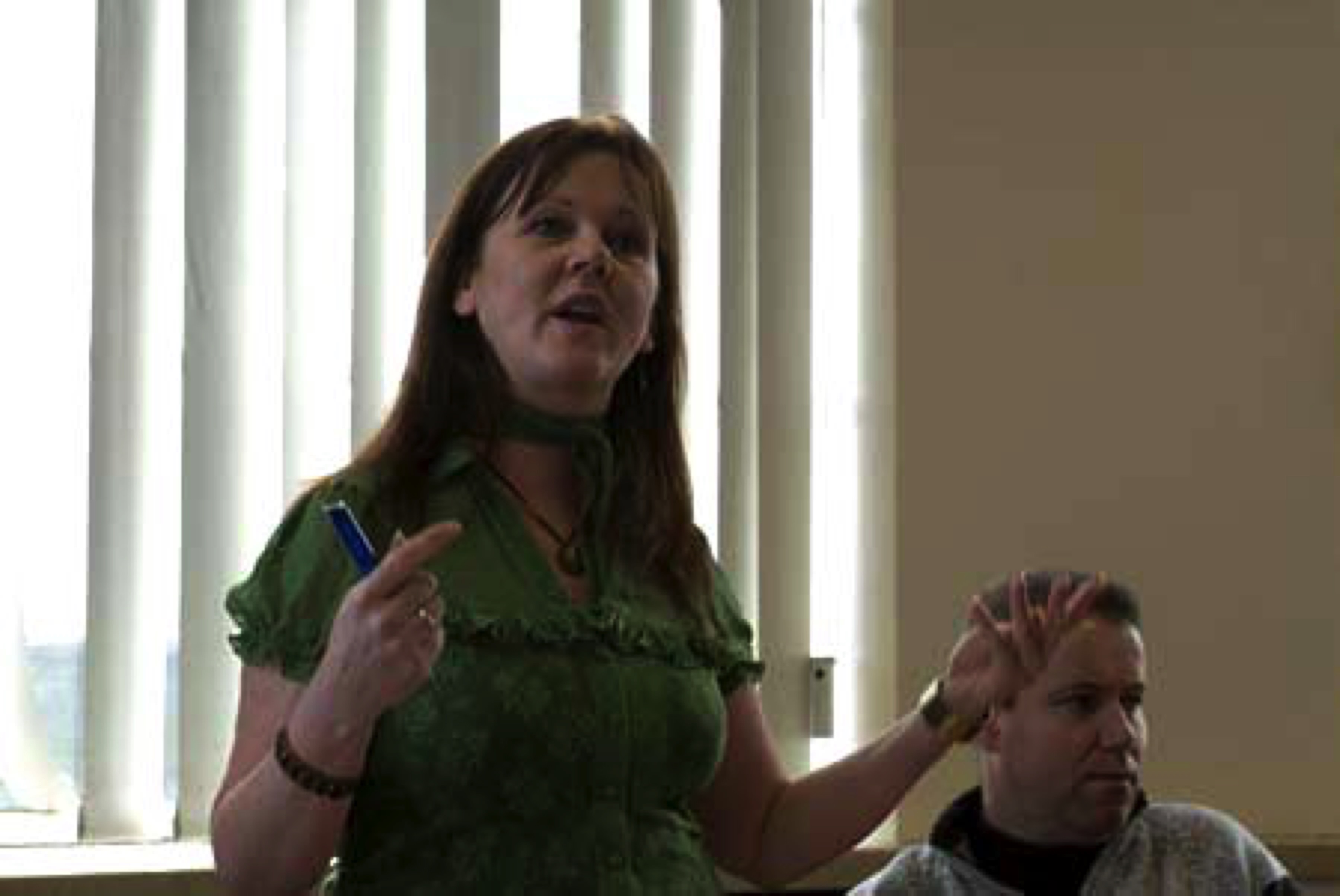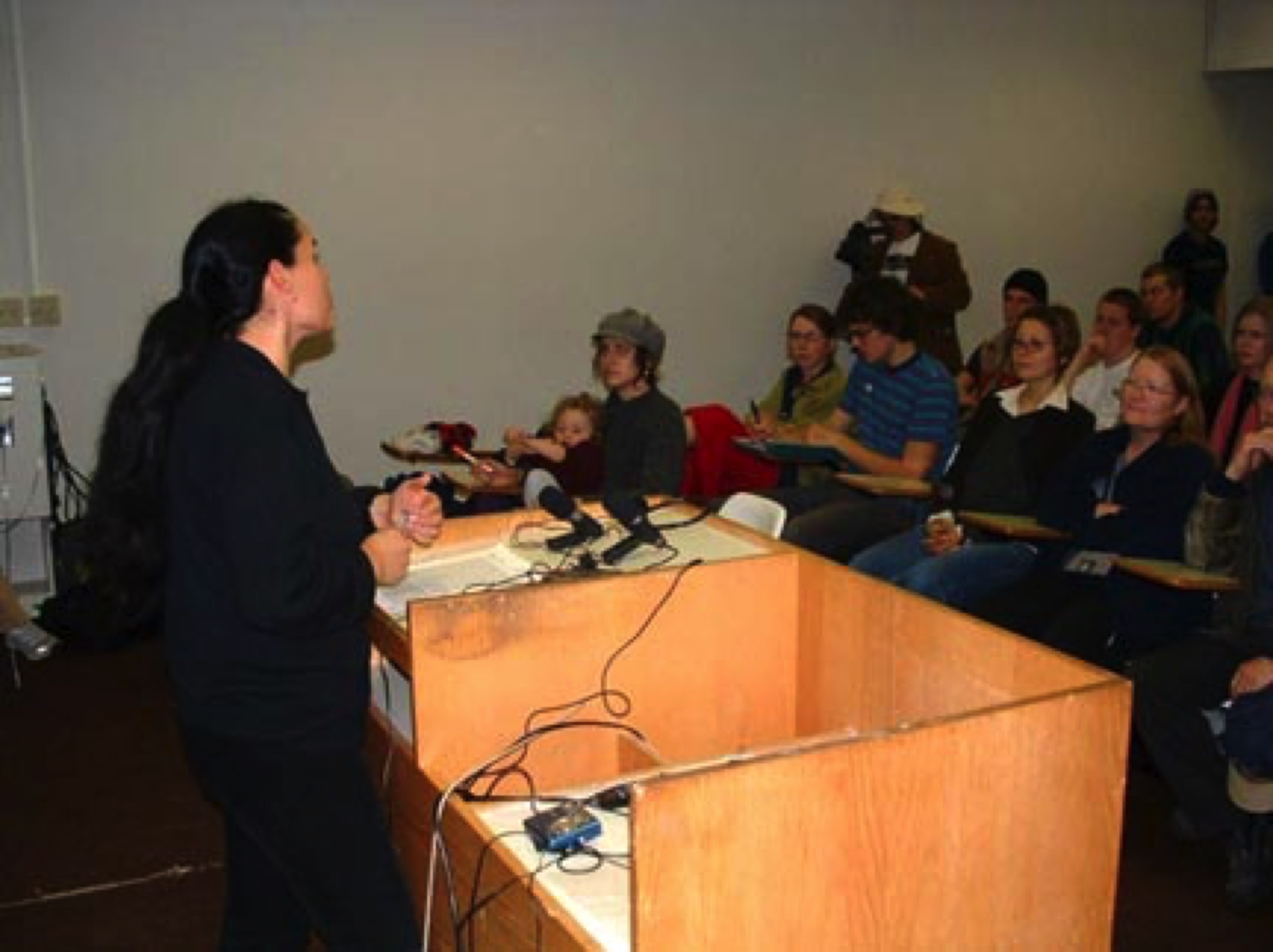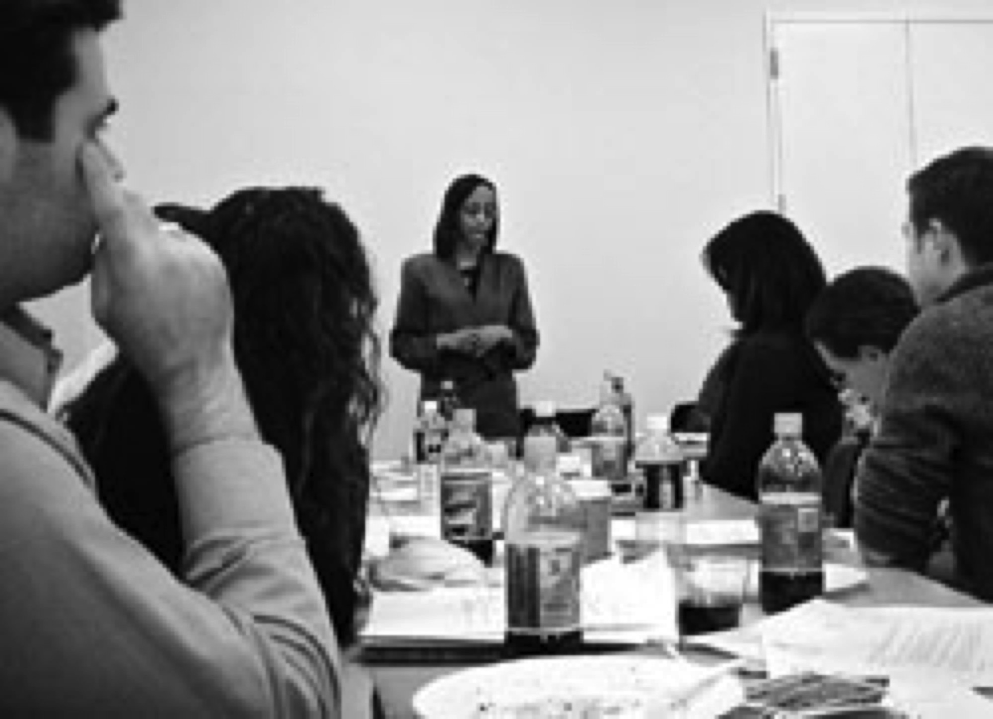 Coca-Cola representative Lori Billingsley defends Coke before the UCSL at New York University. Note the non-Coke products on the table.
