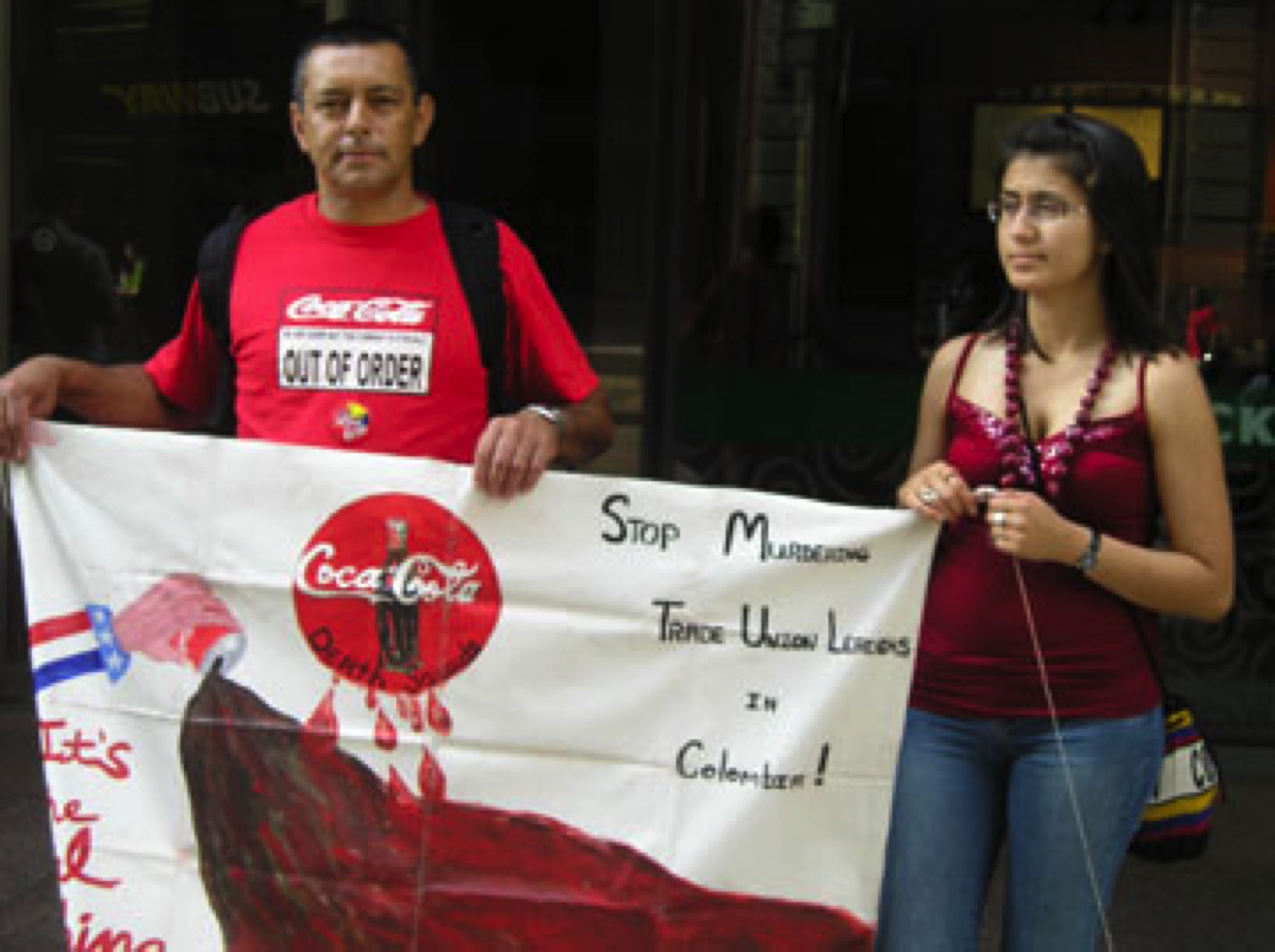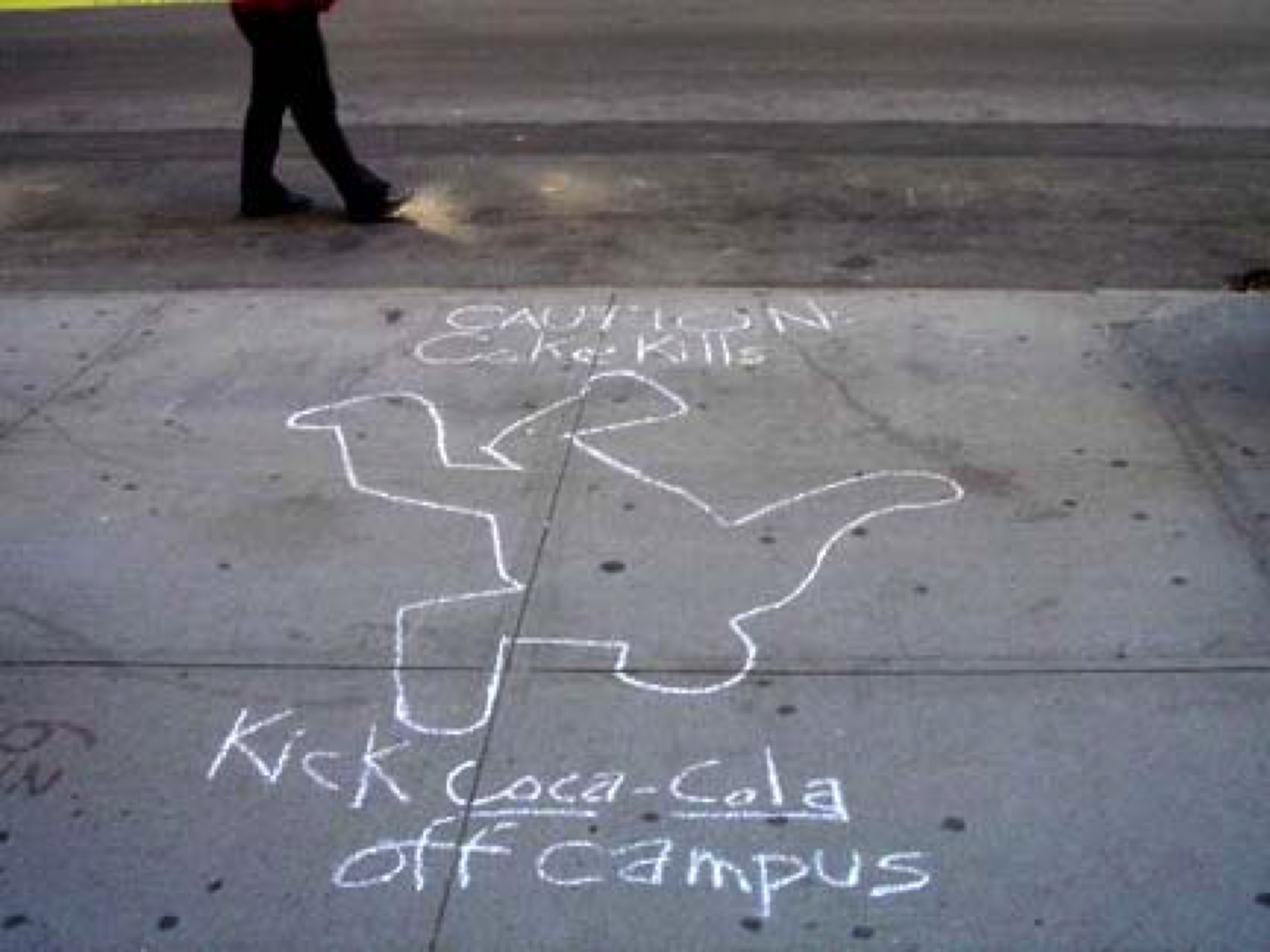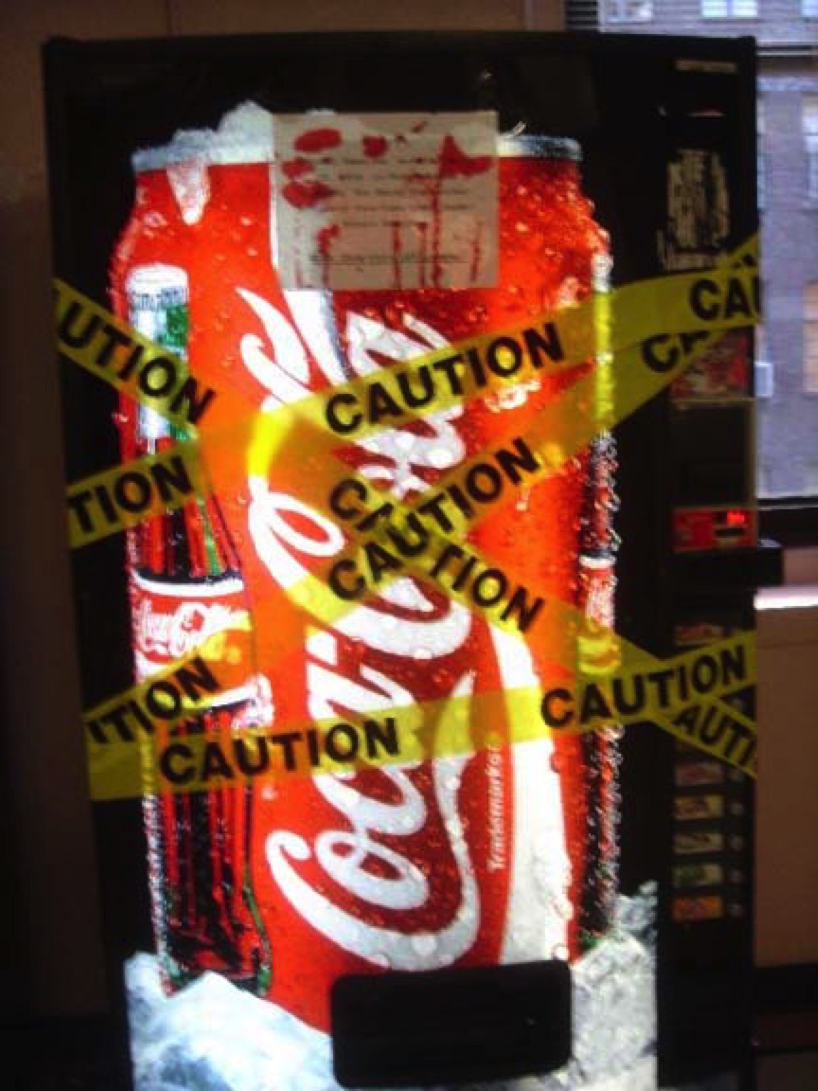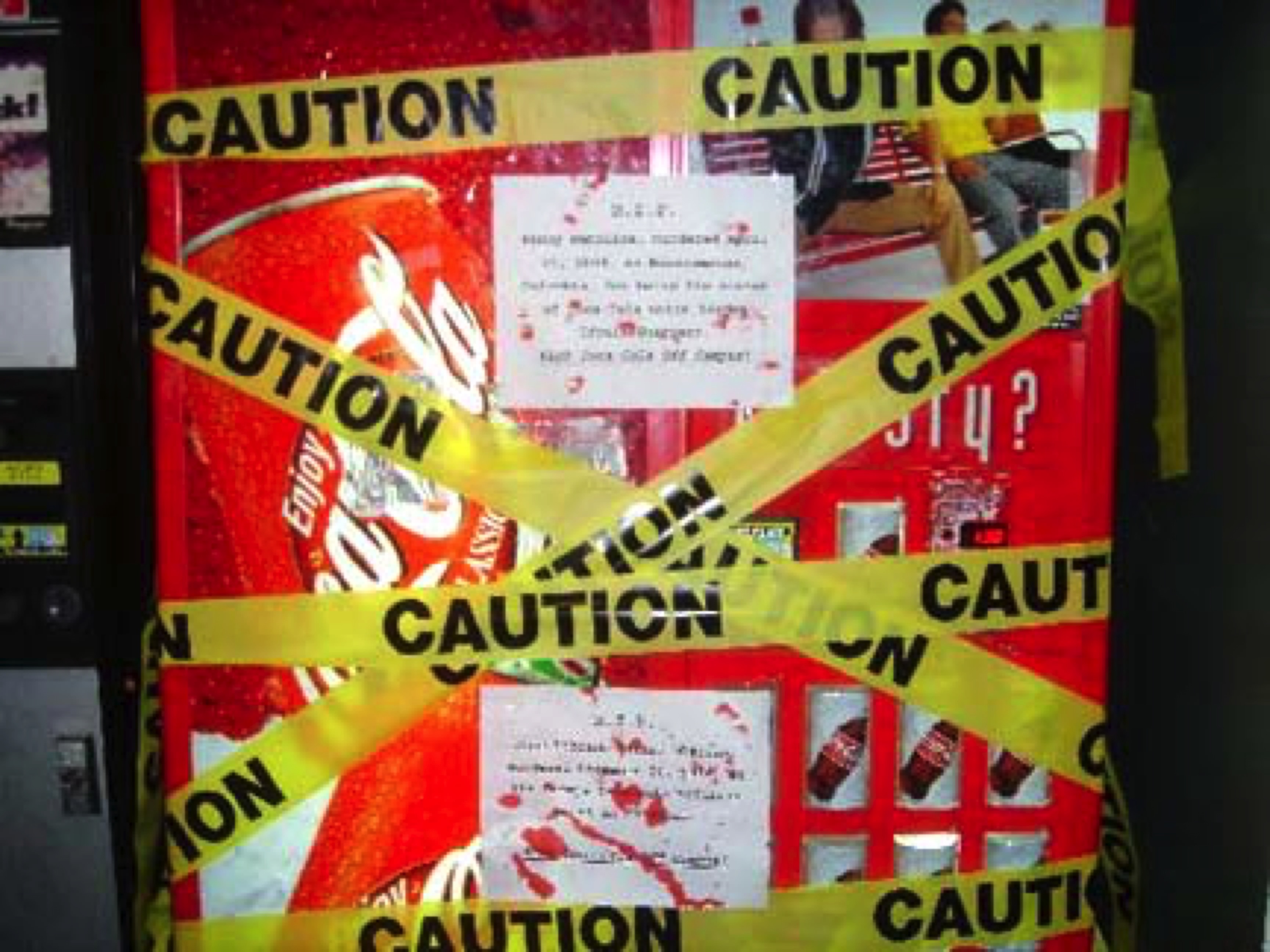 On Oct. 12, activists at New York University turned the school's many Coke vending machines into mock crime scenes to protest Coke's human rights abuses in Colombia bottling plants. Vending machines throughout some of NYU's main buildings were wrapped in caution tape and plastered with the fake blood-spattered obituaries of those who have died as a result of Coca-Cola's policies.