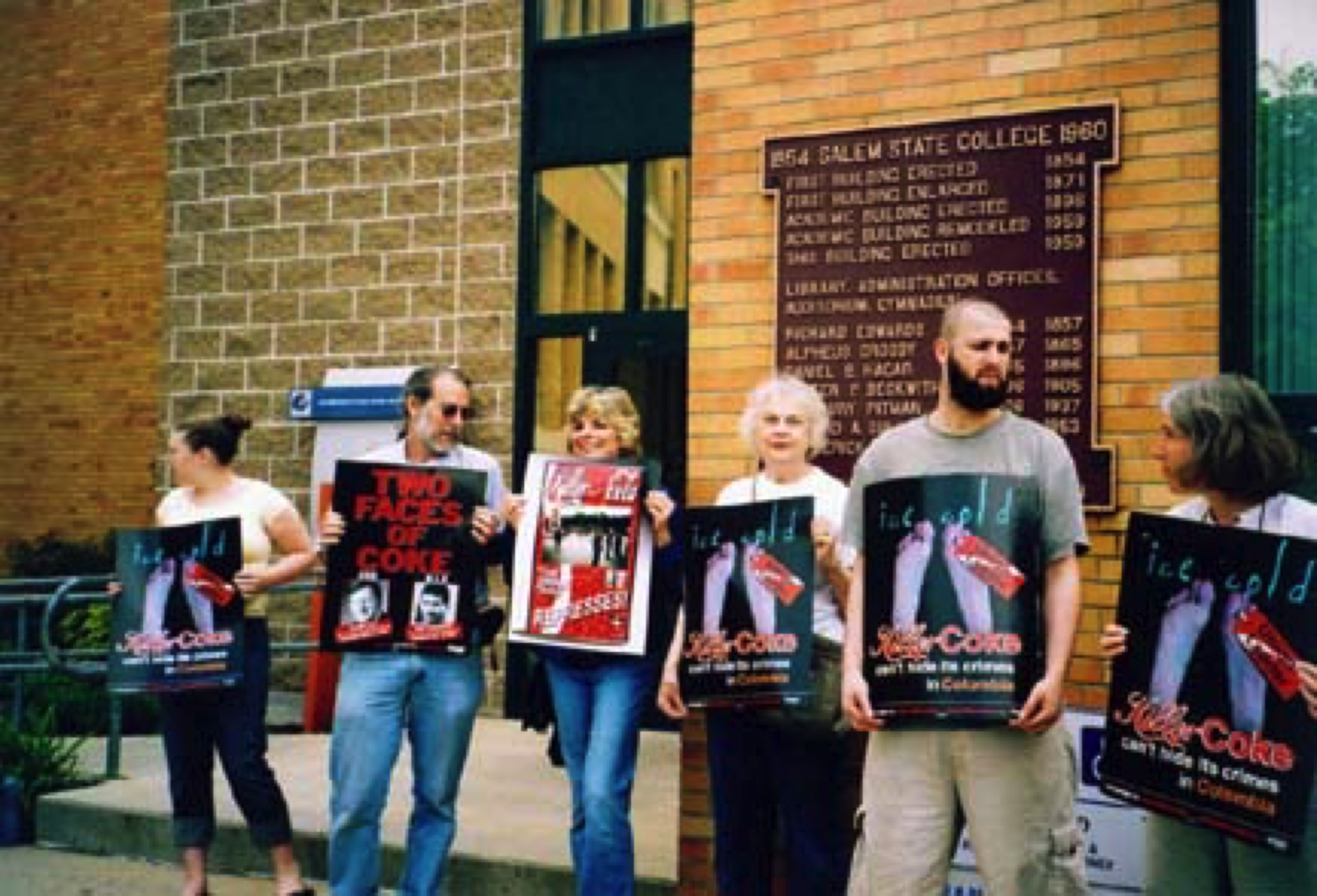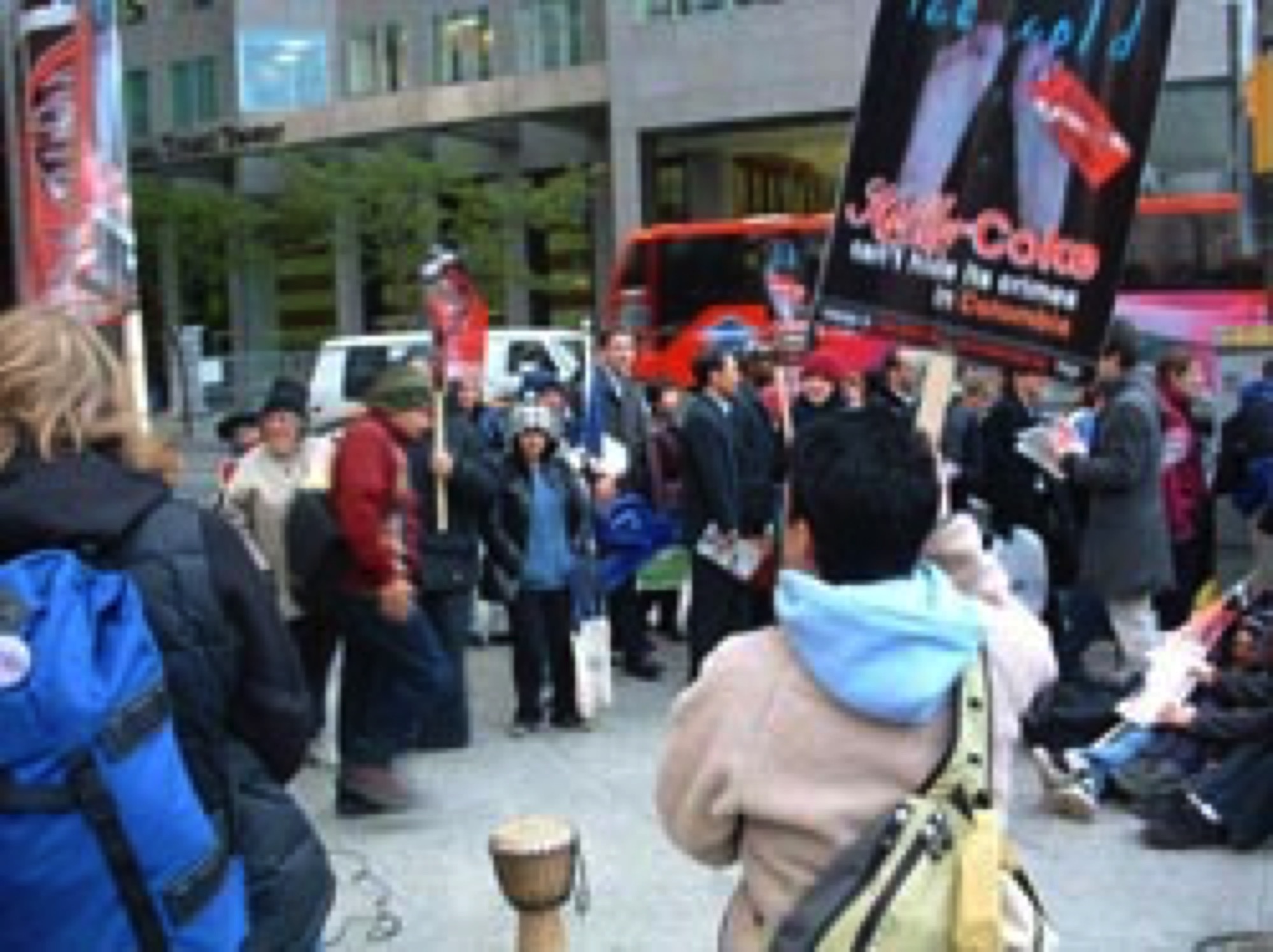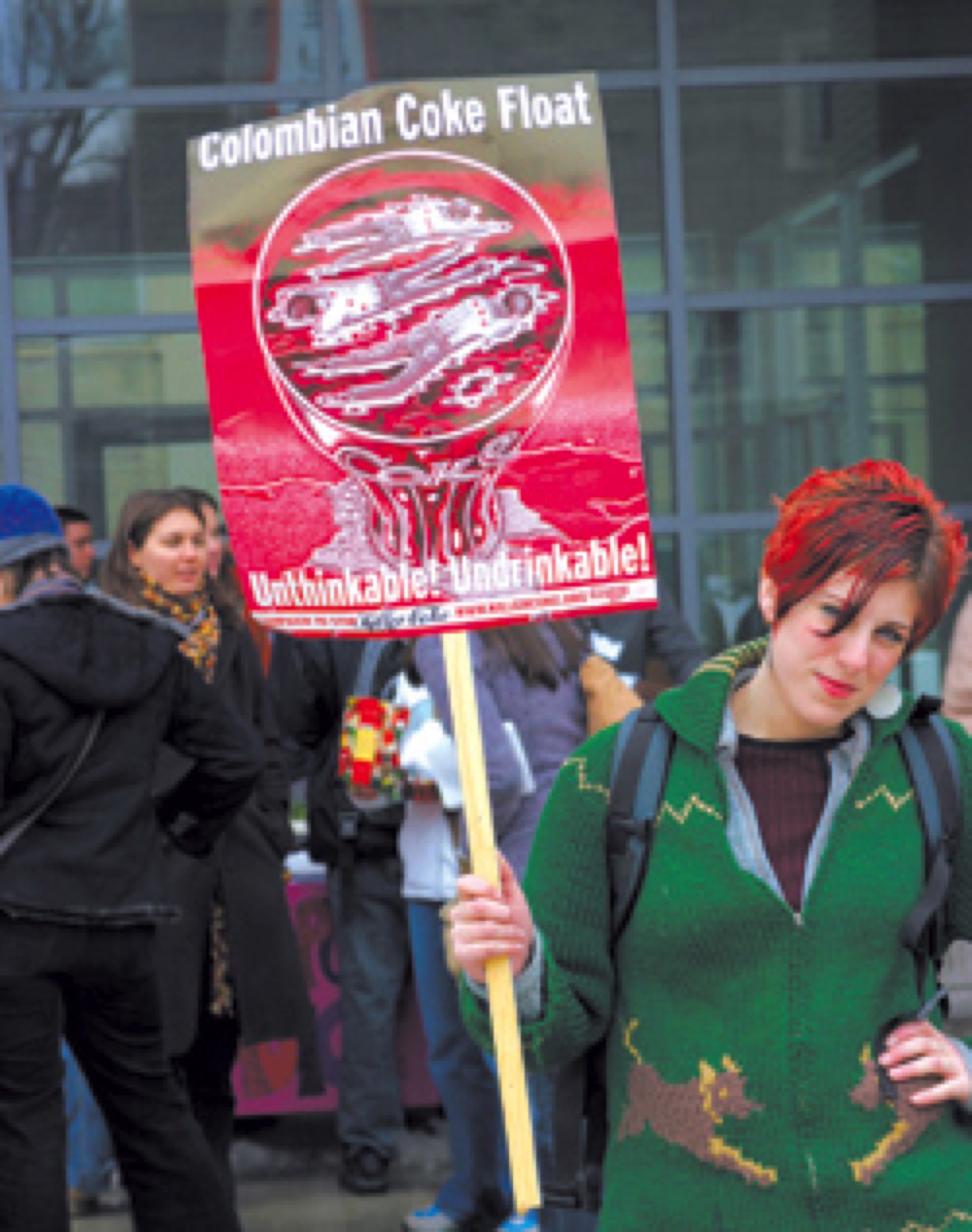 "Killer Coke: Students take a stand against Coke's monopoly at McMaster University — Last Thursday (March 24), students from Campus Choice, opposing Coca-Cola's exclusivity contract at Mac as well as Coke's human rights violations in Latin America, demonstrated outside the Student Center. Students were able to trade in Coke products and sign petitions against Coke."