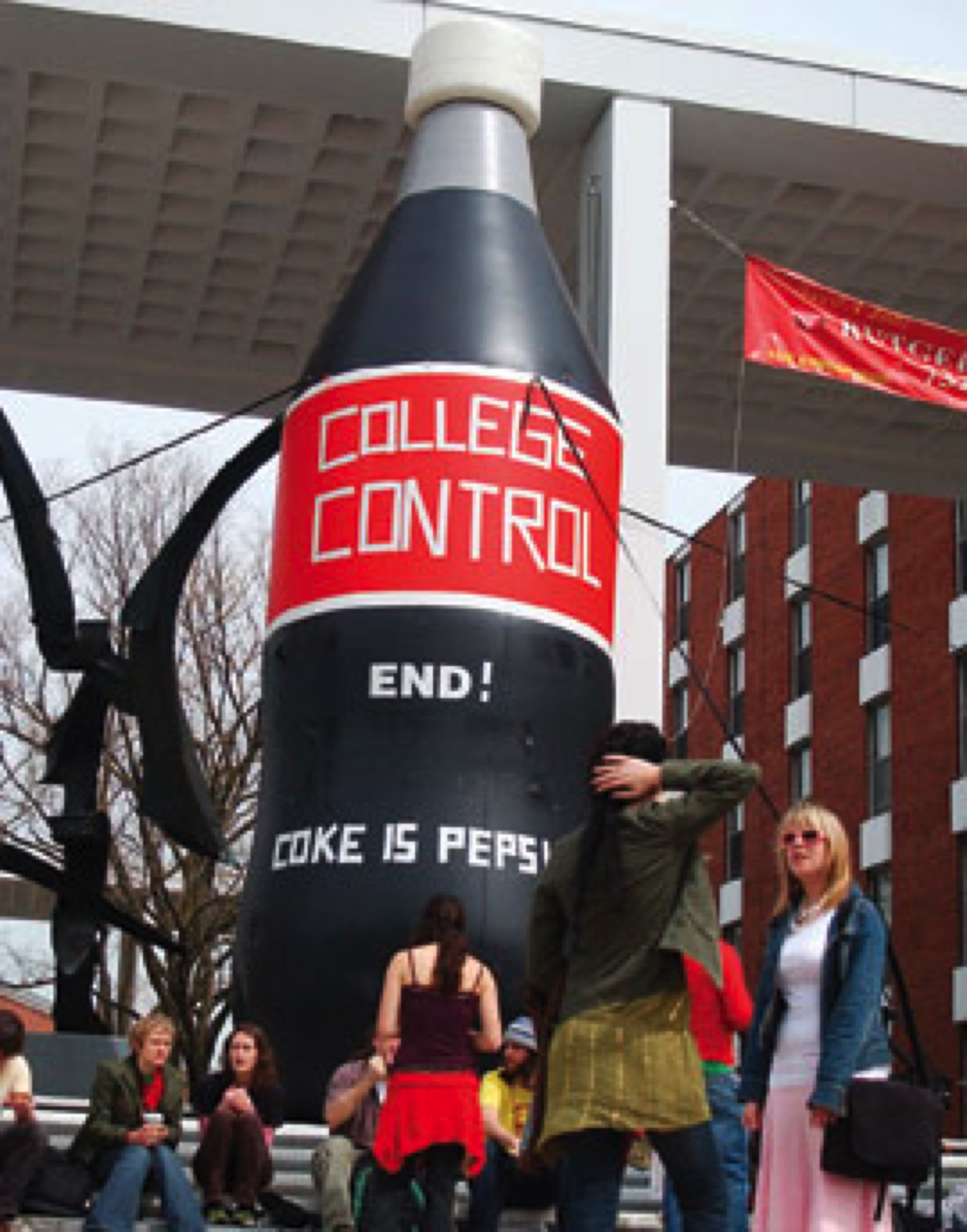 Rutgers University students and protestors stand in front of a giant inflatable mock Coca-Cola bottle on the steps of Brower Commons on the College Avenue campus.
